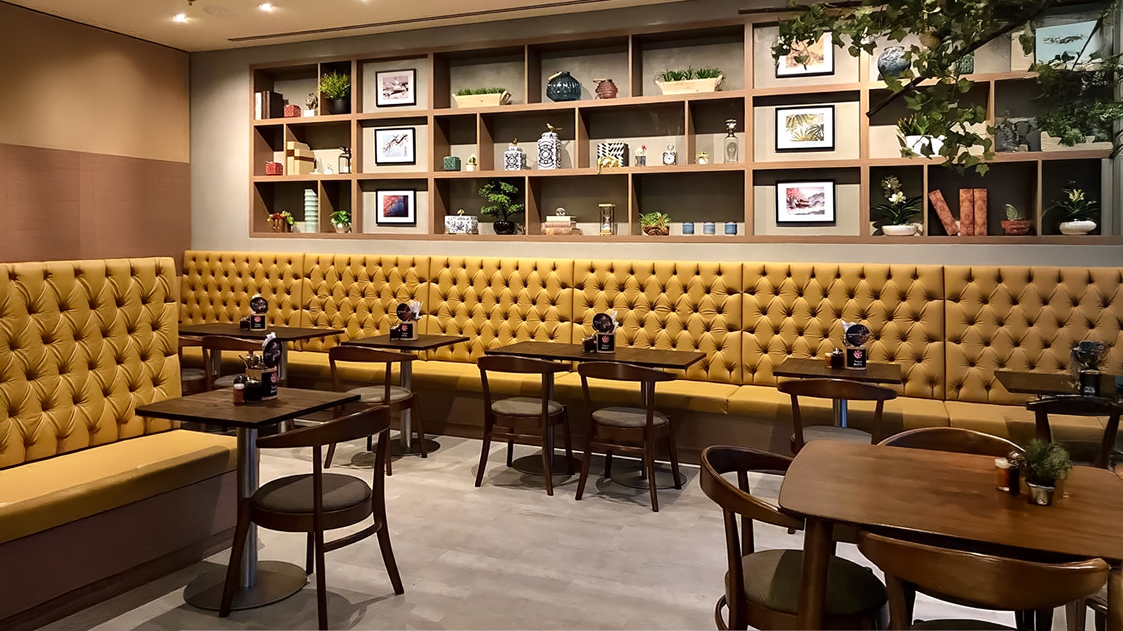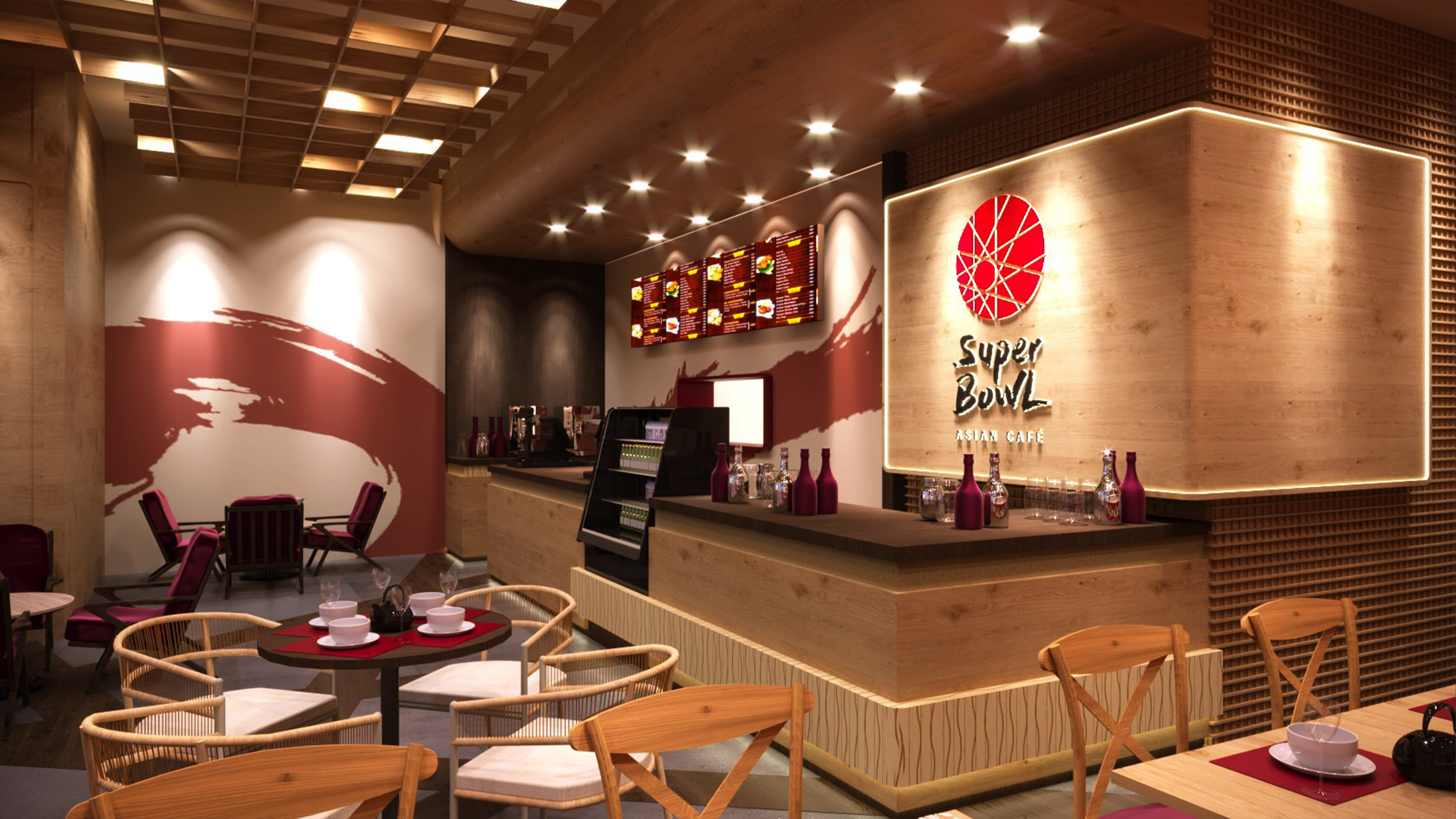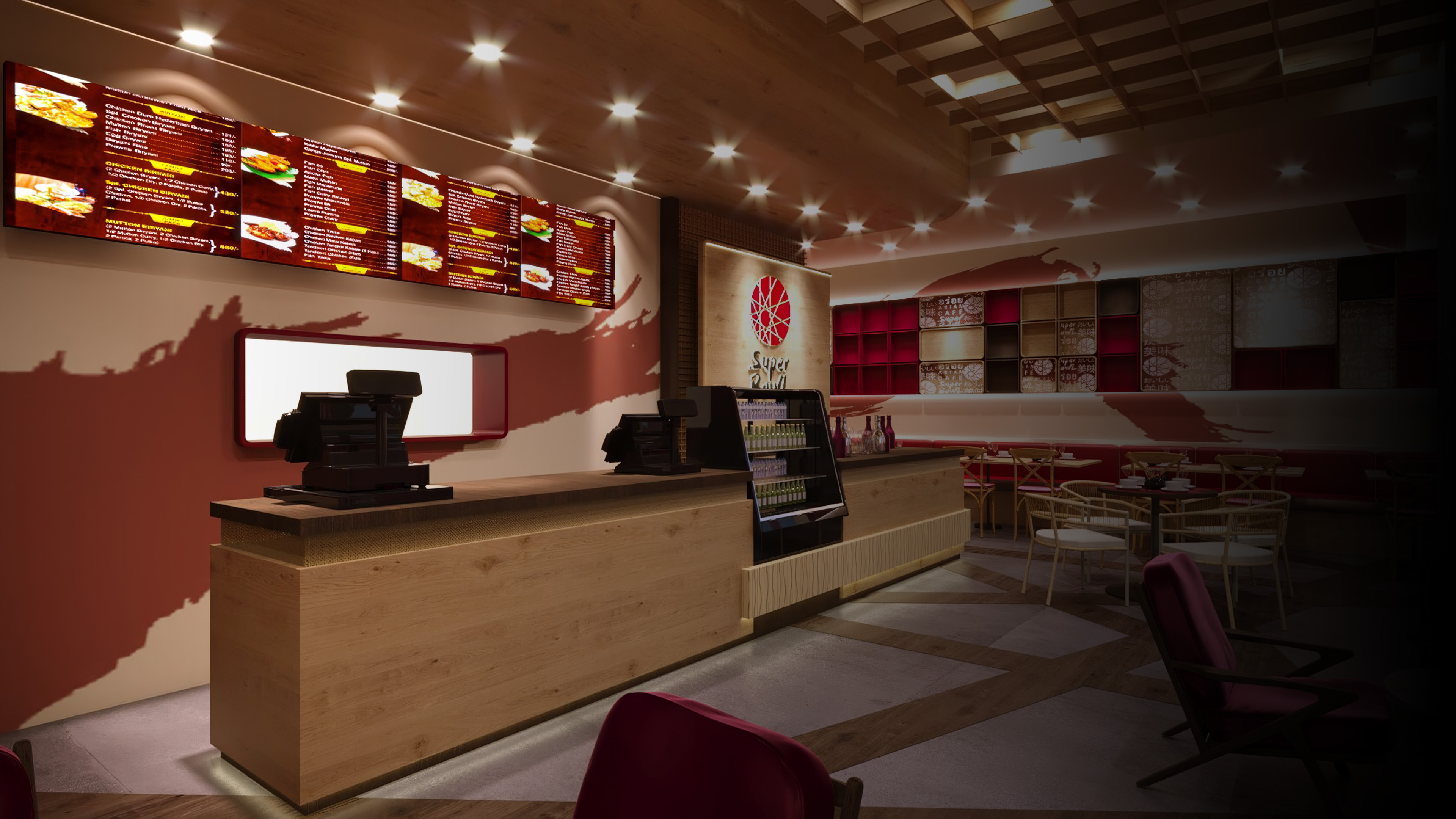The primary challenge for Superbowl was transforming a compact 1,850 FT² commercial footprint in Downtown Dubai into a high-capacity dining space that felt open and airy. We had to integrate a bold, red-centric brand identity without overwhelming the customer experience. By utilizing vertical shelving as a design feature and light timber textures to bounce the warm lighting, we created a sense of volume that belies the unit's actual size.